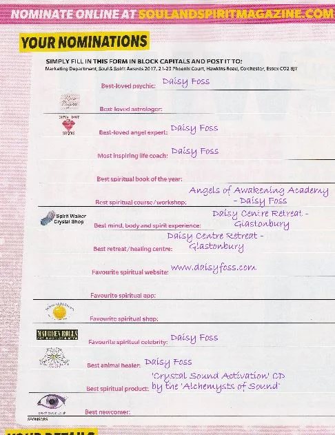 Make your nominations online at this link, or fill in and post the form on page 38 of the May 2017 edition of Soul and Spirit Magazine, by the closing date of 18th May for a chance of winning one of these wonderful prizes: