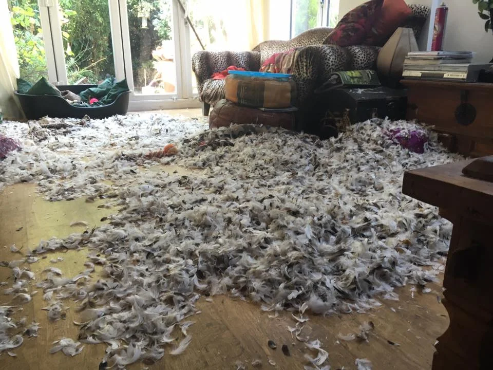 We came straight from the airport and arrived at our friend Teresa's house, we realised she needed more assistance with her house move and life transformation, I offered my help! Then realised I was rather busy with my own stuff!!! So I said I would ask the Angels to give her help, then we laughed and reminded ourselves the last time we asked 100,000 angels they left a snow drift of feathers in the Daisy Centre and St John's car park. See One Hundred Thousand Angels Came to Glastonbury. The next day Tre sent out this picture ------ her house was filled with feathers!!! Her dogs had destroyed a feather bolster, but it's how the Angels show themselves....thankfully Teresa is still talking to me!!!